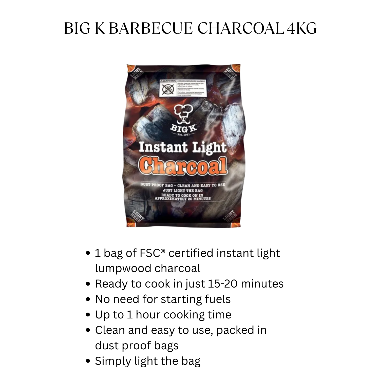 Experience the ultimate grilling convenience with BIG K Instant Light Charcoal! Designed for those who love outdoor cooking, this premium-quality charcoal lights quickly and easily, allowing you to spend less time preparing and more time enjoying delicious meals with family and friends.
